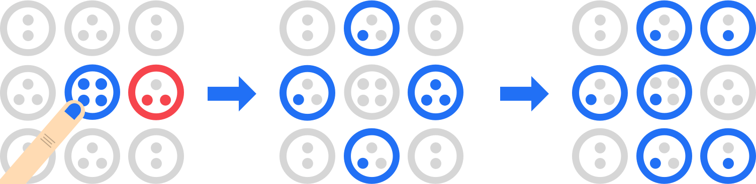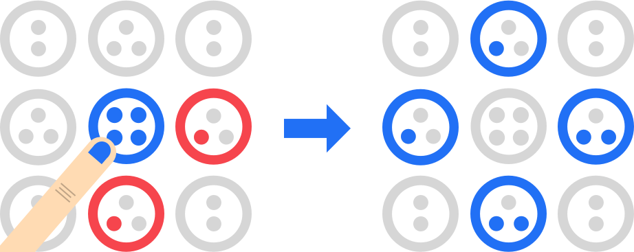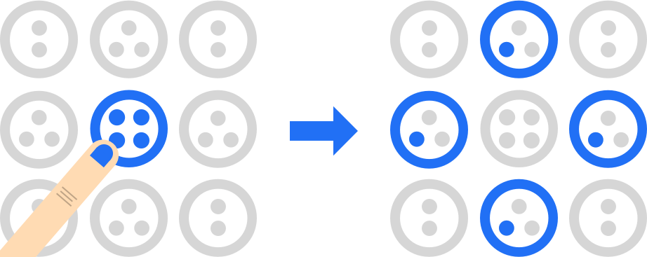 Sobald ein Kreis seine letzte Markierung erhält "explodiert" er und gibt alle seine Markierungen an die Nachbarkreise ab